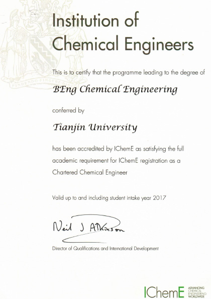 The Chemical Engineering Program of the School of Chemical Engineering at Tianjin University was accredited at “Master Level” by the Institution of Chemical Engineers (IChemE) in 2008. According to the IChemE regulations, the accreditation is valid for a period of 5 years.