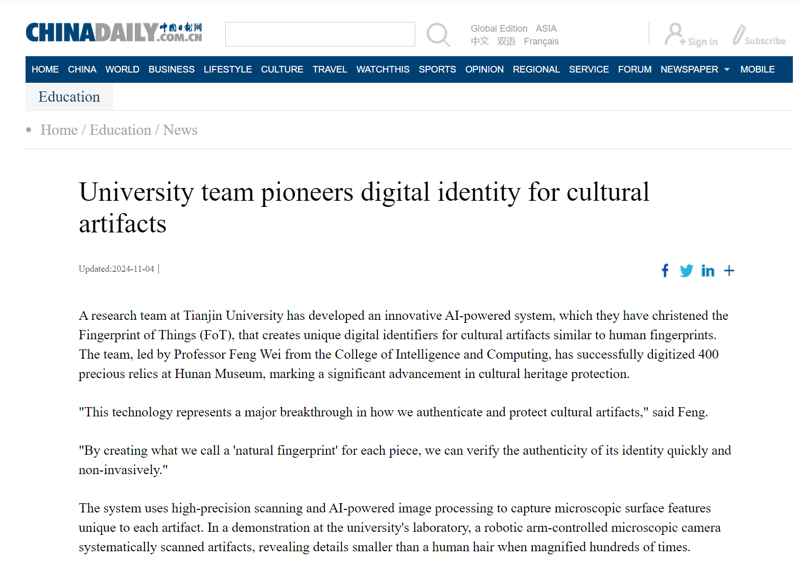 Updated:2024-11-04A research team at Tianjin University has developed an innovative AI-powered system, which they have christened the Fingerprint of Things (FoT), that creates unique digital identifiers for cultural artifacts similar to human fingerprints. The team, led by Professor Feng Wei from the College of Intelligence and Computing, has successfully digitized 400 precious relics at Hunan ...