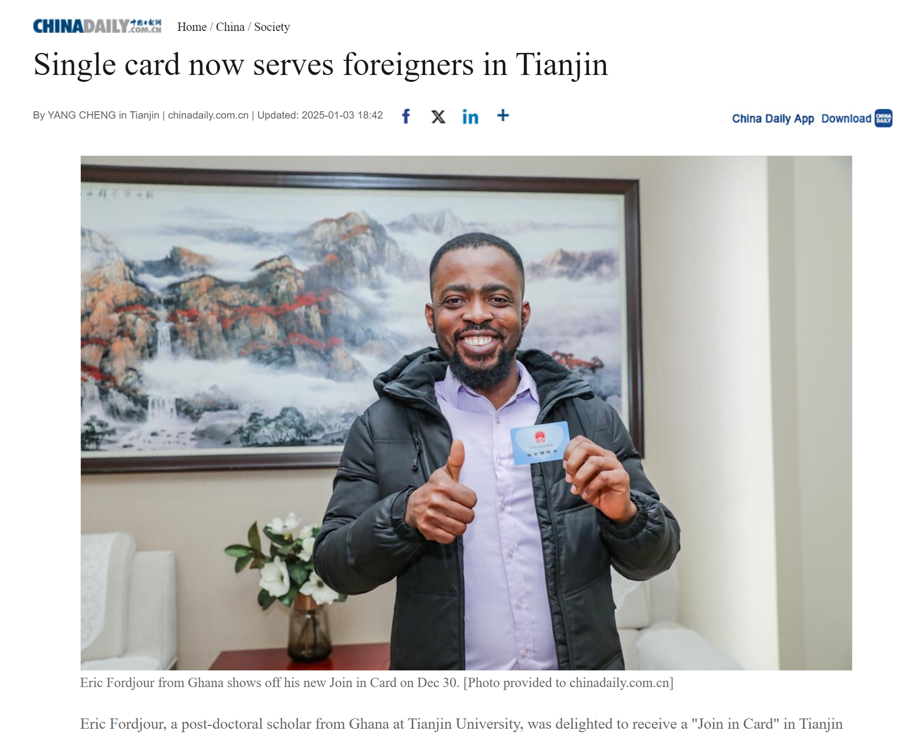 Eric Fordjour, a post-doctoral scholar from Ghana at Tianjin University, was delighted to receive a "Join in Card" in Tianjin on Dec 30.The card, which combines a foreign work permit and a social security identification, was first issued to foreigners in China in December, saving application time and costs to offer tangible benefits to foreign professionals.It realizes the idea of one-applicati...