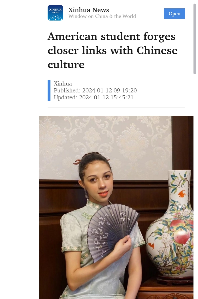 TIANJIN, Jan. 12 (Xinhua) -- Putting on the traditional Chinese dress Qipao, or cheongsam, sticking a wooden hairpin in her hair bun and holding a folding fan, Raina Chareese Luke took photos showing off the Chinese traditional elements that she had on.The 19-year-old American is particularly fond of traditional Chinese clothing, especially the Qipao, a classic tight-fitting dress, and Hanfu, a...