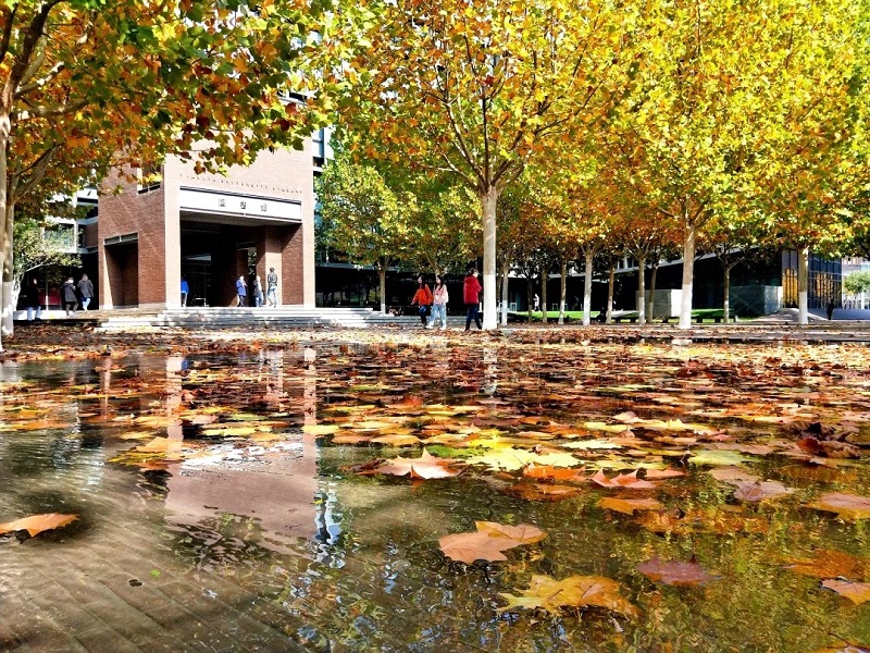 On the late autumn campus, leaves turned yellow and red, falling off the tree. The leaf-less trees and fallen leaves painted the campus into sea of green, yellow and red colors.