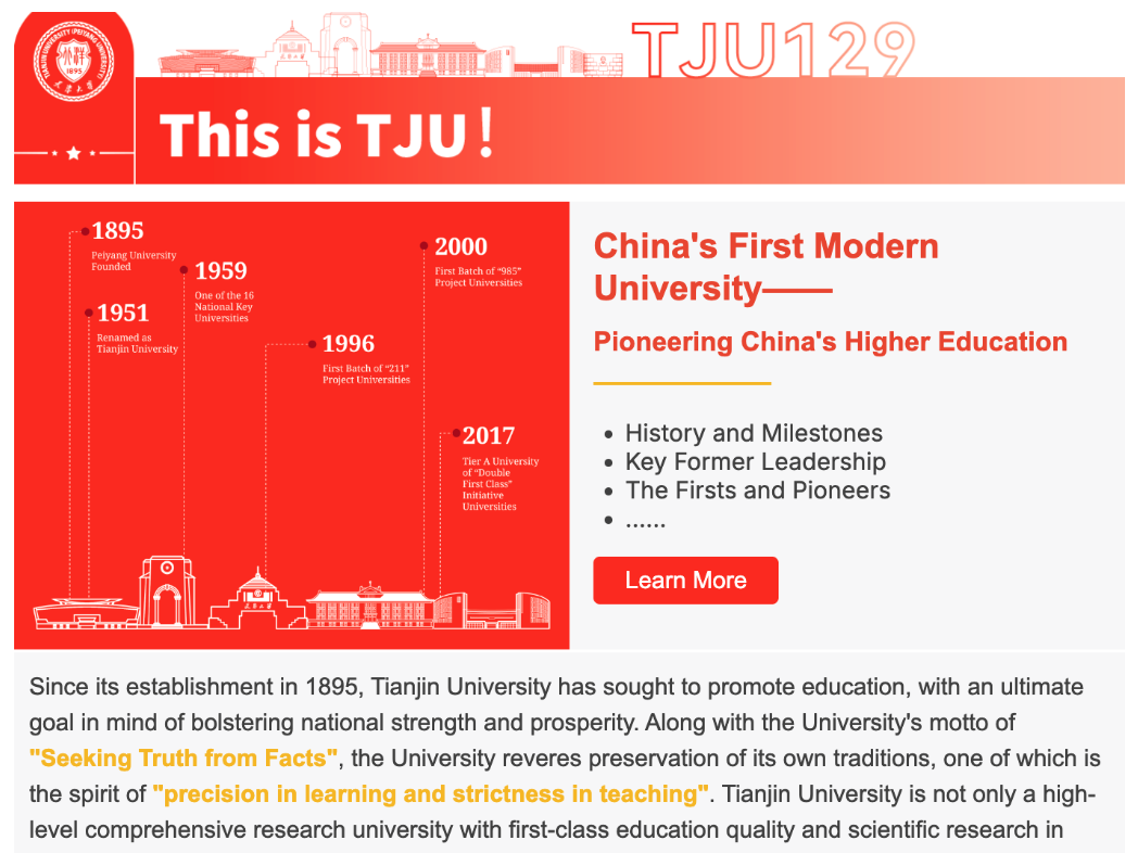 Tianjin University has officially launched its first English e-newsletter, establishing a vital bridge connecting TJU with its alumni worldwide and international friends interested in the university's development.The inaugural issue is a special edition commemorating the university's 129th anniversary. It presents a comprehensive review of TJU's remarkable journey from its establishment as Peiy...