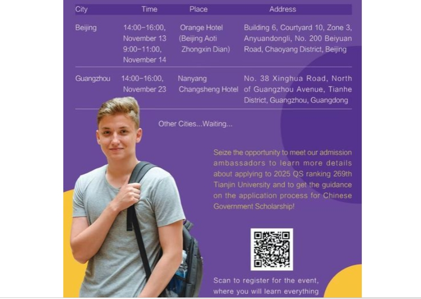 Explore infinite possibilities and encounter Tianjin University International Student Ambassadors!Engage in one-on-one in-depth exchanges and unlock newperspectives on studying in China.Global mindset collisions will ignite your innovative inspiration.Get firsthand study abroad information and seize the initiative.Scan the QR code now to have a reservation with us!See you in Beijing and Guang...