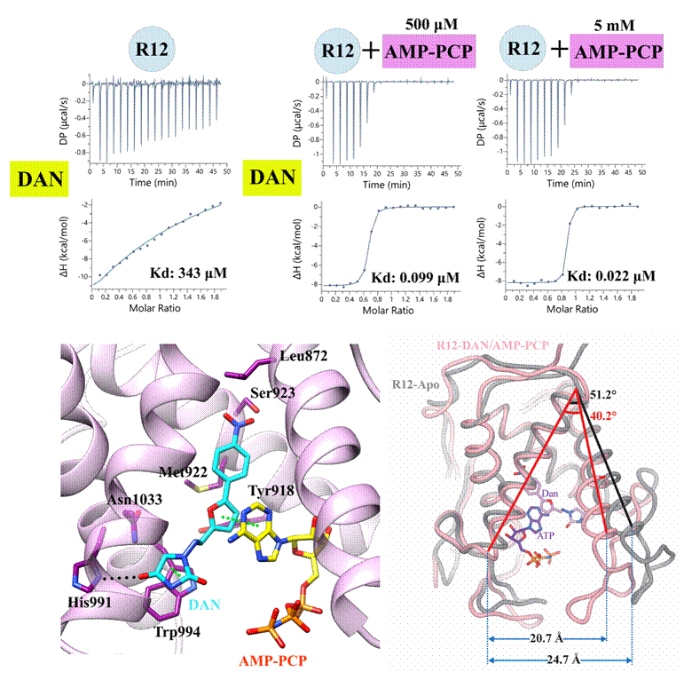 Using an integrated approach combining biophysics, structural biology, and computational biology, the authors revealed that dantrolene (DAN) and its water-soluble analogue azumolene (AZU) inhibit RyR by inducing conformational changes in the R12 domain. Surprisingly, DAN/AZU do not bind R12 alone; instead, they cooperatively bind together with intracellular nucleotides ATP/ADP within a pseudo-symmetric pocket. Direct molecular interactions between DAN/AZU and ATP/ADP drive a “clam-shell” closure of R12. This binding mode explains the ATP/ADP-dependent inhibition and suggests that cellular metabolic state may modulate drug efficacy. Together with cryo-EM data, the study further clarifies the allosteric gating mechanism by which DAN/AZU regulate RyR activity.