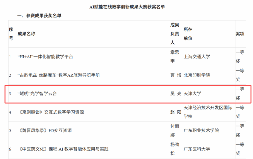 Tianjin University’s optical large-model project “Sui Ming” has won the first prize in the national “AI-Empowered Online Teaching Innovation Achievement Competition,” organized by the China Association for Educational Technology. As the only first-prize recipient from the optics field, the model was recognized for its breakthroughs in vertical large-model development and its comprehensive service system, highlighting the university’s growing strength in interdisciplinary research and industry-academia integration.