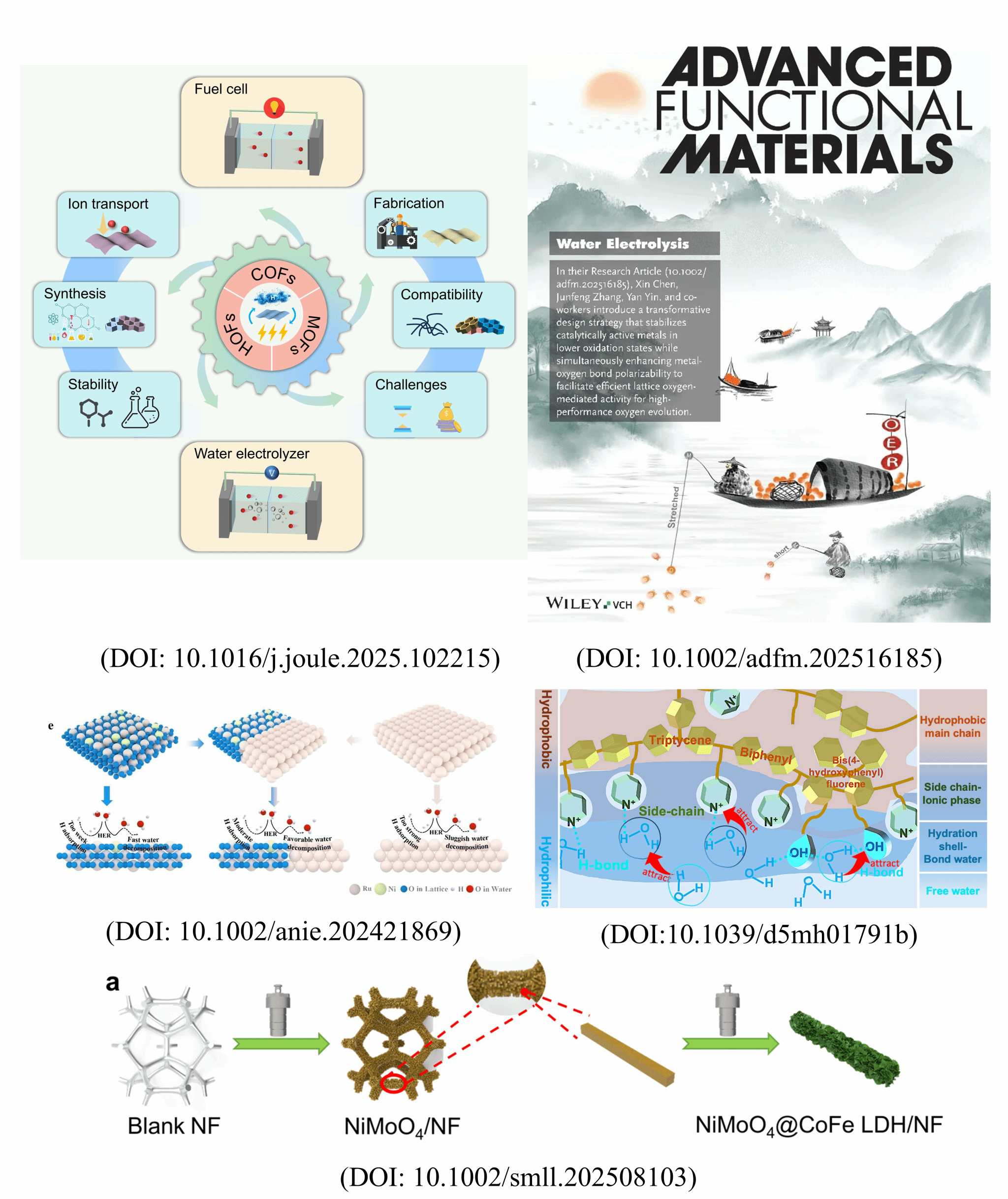 In the area of oxygen evolution reaction (OER) catalysts, which are related to electrolyzers for hydrogen production, the team published a cover paper titled “Stretching metal-oxygen bonds to decouple activity and stability of water electrolysis” in Advanced Functional Materials (DOI: 10.1002/adfm.202516185, Frontispiece). This research breaks from the conventional pursuit of high-valence metal species. Instead, it innovatively employs a dual strategy of "stabilizing low-valence metals + stretching metal-oxygen bonds," successfully resolving the typical trade-off between catalyst activity and stability. By stabilizing metals like nickel and iron in lower valence states and elongating the metal-oxygen molecular bonds, the team effectively activated the reactivity of lattice oxygen while significantly enhancing structural stability. Experimental results demonstrated that the developed NiFe-LP catalyst, based on this strategy, requires a smaller overpotential of only 219 mV to achieve a current density of 10 mA cm⁻² and operates stably for over 1000 hours at a high current density of 5 A cm-2. This achievement provides a novel design approach for developing efficient, stable catalysts for water electrolysis, with significant importance for advancing green hydrogen technology.