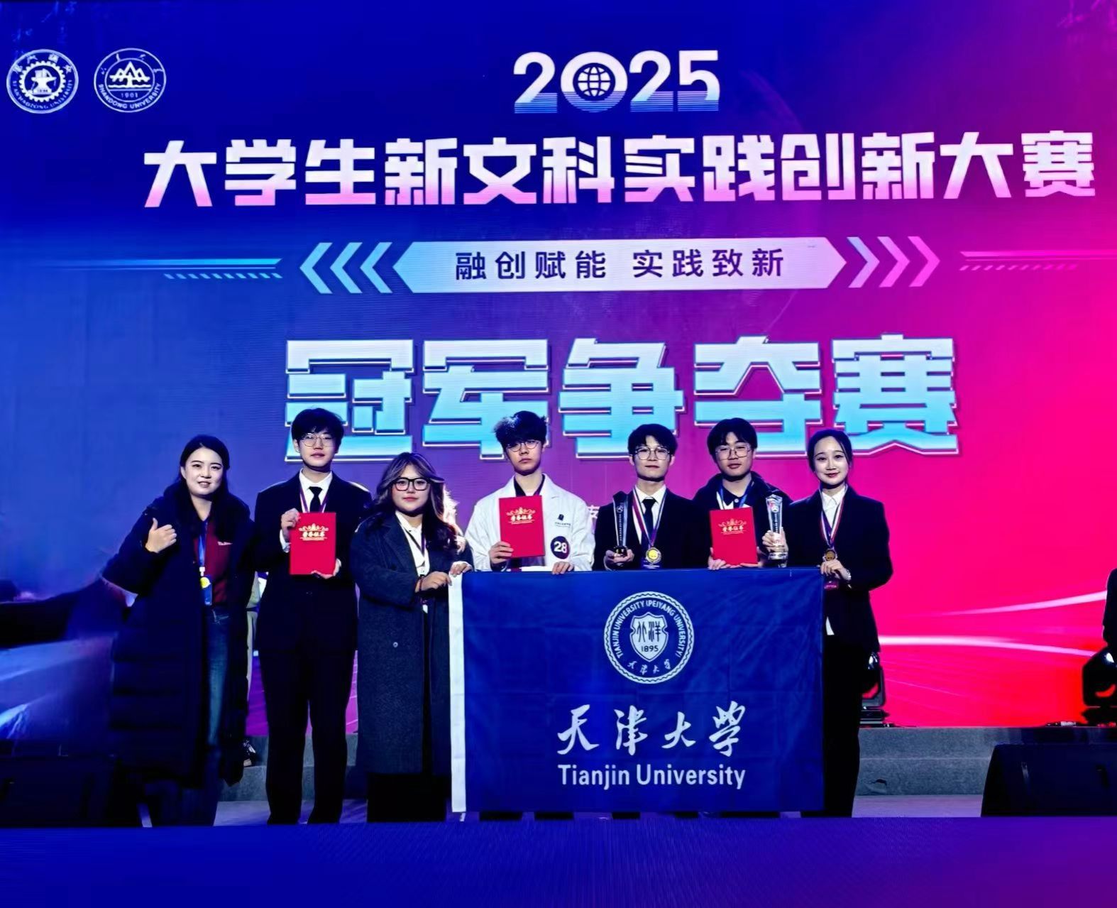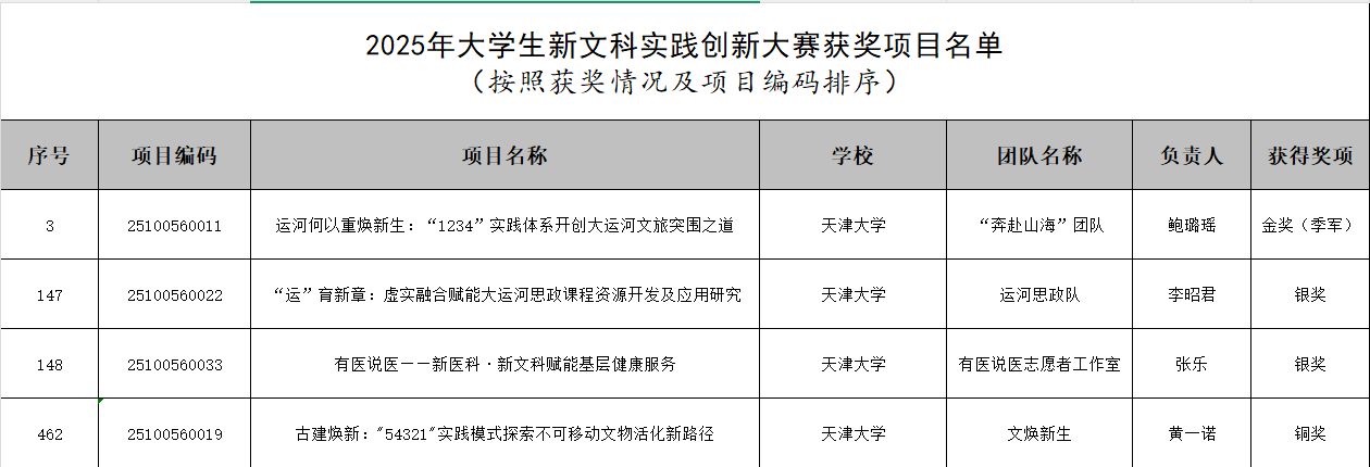 From November 29 to 30, the 2025 National New Liberal Arts Practice and Innovation Competition finals were held in Xi’an, featuring 454 projects from 221 universities nationwide. Tianjin University’s teams won one Gold Award (third place), two Silver Awards, and one Bronze Award. Two faculty members received the “Outstanding Instructor Award.” Notably, the “Rushing to the Mountains and Seas” team secured third place with their project on revitalizing the Grand Canal’s cultural tourism.