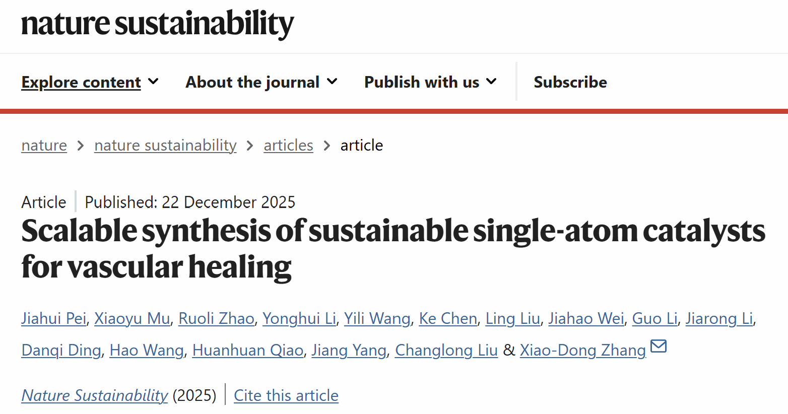 Professor Zhang Xiaodong’s team from Tianjin University has developed a scalable, highly biocompatible and atomically tunable two-dimensional single-atom biocatalyst and offered a novel solution for the long-term treatment of cardiovascular and cerebrovascular diseases. The findings were published in the international journal Nature Sustainability on December 22, 2025.