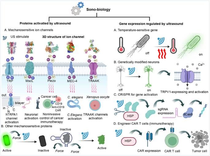 Focused on how biological systems perceive and respond to ultrasound, research reveals that mechanical forces activate mechanosensitive ion channels (Figure. 3), regulating calcium signaling to gene expression, particularly amplified in neural systems. Emerging sonogenetics techniques express mechanosensitive proteins in specific cells, enabling remote, non-invasive neural circuit modulation and offering new pathways for brain disease research.