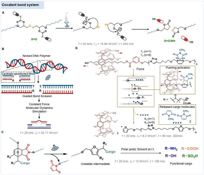 Ultrasound activates sonosensitizers to generate reactive oxygen species (ROS), selectively destroying tumors/pathogens (sonodynamic therapy). It also triggers chemical bond cleavage (Figure. 2) for "on-demand" drug release (ultrasound-triggered drug delivery), significantly reducing systemic toxicity.