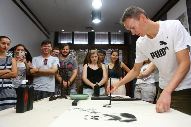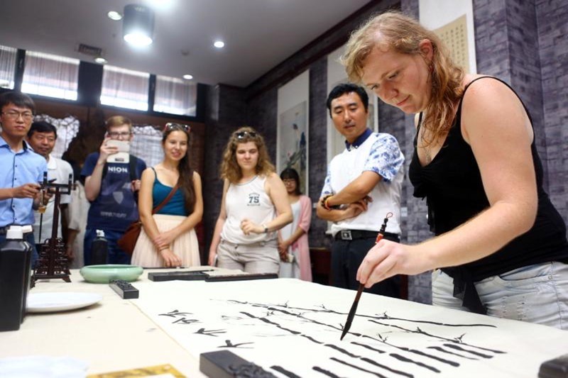 A Slovakian student trying Chinese painting after Liu Jun showed them how to paint bamboo, a classic element in Chinese painting.