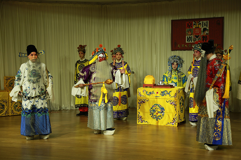 The Peking Opera “Dragon and Phoenix Palace” tells a historical story that happened during the Ming dynasty. After the old emperor died, his concubine Li attended to state affairs because the new emperor was too young. Li’s father intended to usurp the throne and deceived Li into assisting him. Two loyal ministers put their own lives in peril and twice unmasked Li’s father’s intentions, thus protecting the emperor’s throne. This opera belongs to an old style, which has endured for a long time due to its popular songs, large-scale scenes, the riveting plot and high-quality actors performing it. Liu Baojie, Ma Shoufeng, Li Zhihong, Zang Lei, Qi long, Wang Jiajun, Liu Kun, and other faculty members and students from Tianjin University and Tianjin Normal University took part in this opera. Their brilliant performances fully displayed the peculiar charm of Chinese cultural essence, winning applause from the audience.