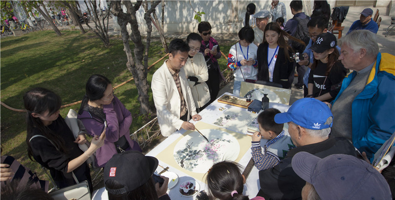 Liu Jun, a student of Wang Xuezhong, draws a traditional painting of crabapple blossoms and introduces the techniques to visitors on site.