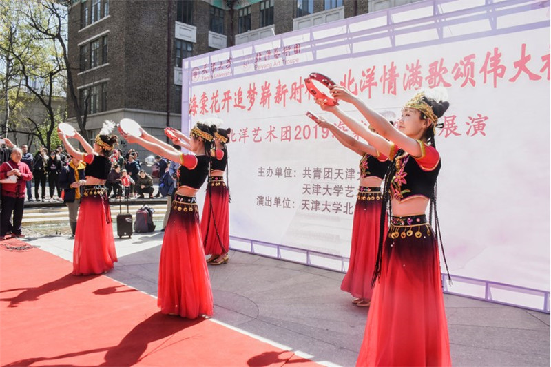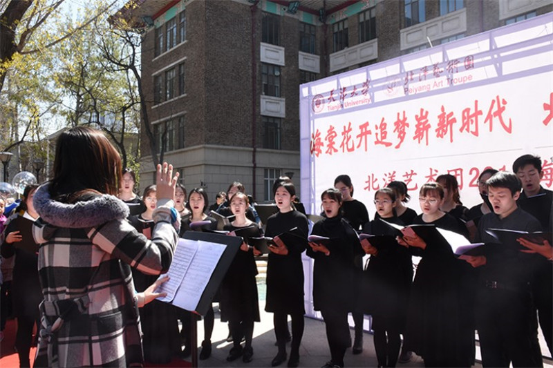 A performance by the Peiyang Art Troupe in the open air was also very eye-catching. Debuting with the children's choir from the primary school affiliated with Tianjin University, musical instrument performance, cross talk shows, and dances picked up the rhythm and created an animated atmosphere that made flower sightseeing more enjoyable.