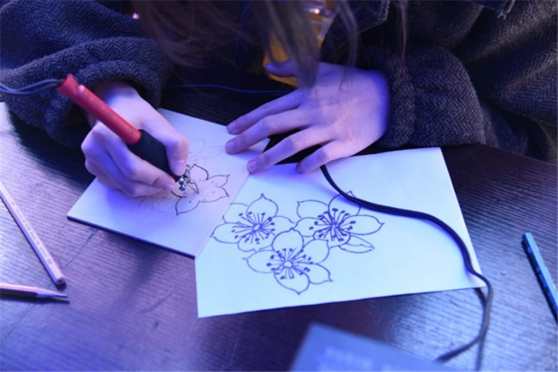 Students try out traditional folk arts—pyrograph of crabapple flowers