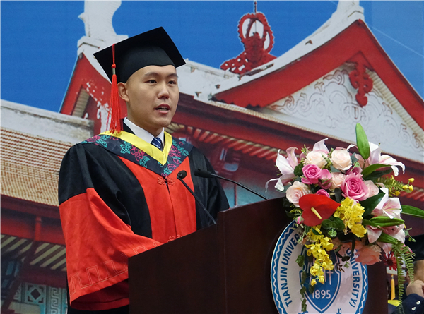 Sui Xin, a doctoral student of the School of Mechanical Engineering, beginning his doctoral career in 2014, spoke on behalf of graduate students. During his eight years of study at Tianjin University, he witnessed the great development and changes of the university and felt "honored". During the school years, under the careful guidance of his supervisor, Sui Xin participated in and completed two national natural science foundation projects, more than 10 academic papers in journals such as Science Citation Index (SCI) and The Engineering Index (EI), won national scholarships for undergraduate and doctoral studies, and was awarded as the outstanding student of Tianjin. After graduation, he resolutely devoted himself to the cause of national defense. With his solid and comprehensive professional skills, he practiced the social responsibility of benefiting the country and the people, and encouraged himself to forge ahead to contribute to the development of the national defense of the motherland.