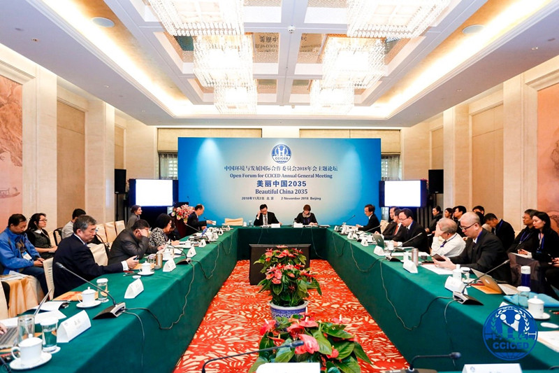 Two topics are discussed during the forum: goals and targets for environmental quality; needs for institutional and policy innovation. Around 40 Chinese and foreign CCICED members, special advisors and observers attended “Beautiful China 2035”, the Open Forum for CCICED Annual General Meeting 2018, including Professor SUN Youhai, Dean of Law School, Tianjin University; Mr. Zhou Wei, Member of the CCICED and Chief Engineer of the Ministry of Transport; Hideki Minamikawa, Member of the CCICED and the Japan Environmental Sanitation Center; Ms. Jessica Kao, former Chief of Staff and Senior Policy Advisor for Pacific Southwest of the United States Environmental Protection Agency; Mr. WANG Yi, Member of the Standing Committee of the National People’s Congress and Vice President of the Institutes of Science and Development, Chinese Academy of Sciences; Research Fellow LI Junfeng, Special Advisor of the CCICED and former Director of the China National Center for Climate Change Strategy and International Cooperation; Seung-Joon Yoon, Member of the CCICED, former President of the Korea Environmental Industry & Technology Institute, and Professor of Seoul National University, Korea; Jan Bakkes, Senior Project Leader of Global and European Outlooks, PBL Netherlands Environmental Assessment Agency; YU Hai, Research Fellow of the Policy Research Center for Environment and Economy, Ministry of Ecology and Environment; and Mr. LI Jifeng, State Information Center.