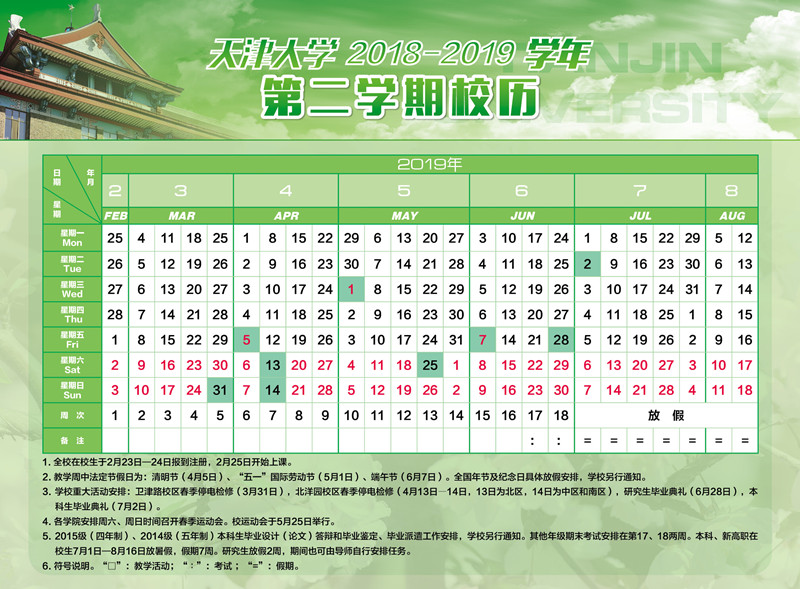 Tianjin University 2018 - 2019 Second Semester Academic Calendar