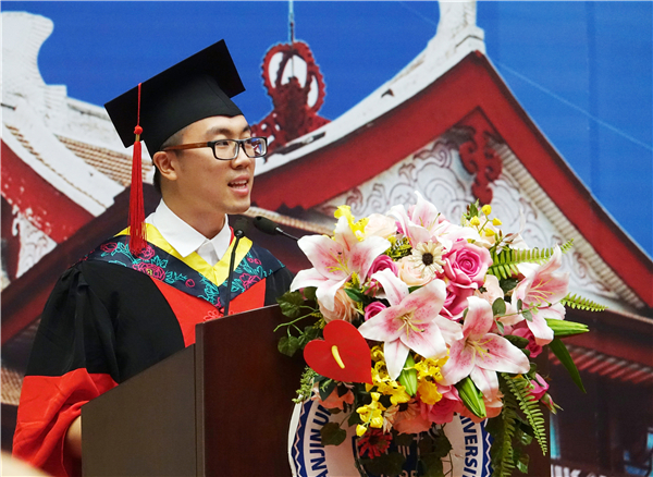 Zhang Yinyu, a Ph.D. graduate admitted directly as an undergraduate from the School of Materials Science and Engineering, spoke on behalf of all the graduate students. In his speech, he expressed his sincere gratitude to his parents, teachers and alma mater. Under the guidance of his instructor Professor Liu Wenguang, Zhang published five SCI high-level papers during his PhD studies as the first author or co-author with a total impact factor of 92.1. Upon his graduation, he turned down excellent opportunities to further his study abroad or take up teaching posts in universities at home. He also gave up the lucrative job offers in China’s big cities like Beijing, Shanghai and Guangzhou. Instead, he chose to work at the China Academy of Engineering Physics, which is known as an "Anchor of National Defense", devoting himself to the development of China’s western region and contributing to China’s military industry. He fully demonstrated a TJU student’s great passion in science and made himself a pride product of his alma mater.