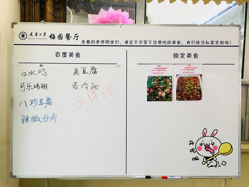 Faculty and students can leave messages on the order board, writing down the delicious dishes they want to eat. The canteen cook will choose two dishes to make from the board every day and all the faculty and students are then able to buy them from the window.