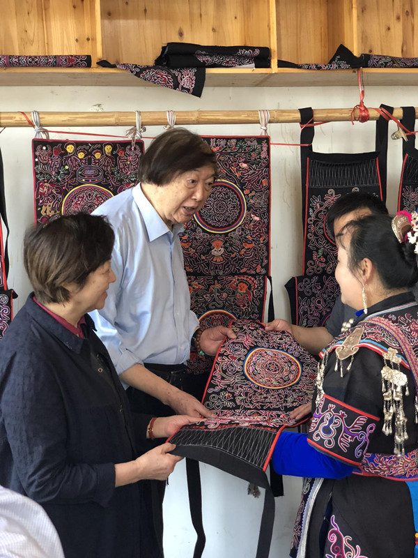 For villages that were not on the list, Feng investigated villages in Jinping County and Rongjiang County. During the visit to Jiuzhai Dong Cultural Museum in Jinping County, Professor Feng talked with Long Lingxiang, the national inheritor of Dong embroidery. He inquired in detail about the protection and inheritance of the intangible cultural heritage of Dong embroidery. In Sanpan village, Professor Feng listened to the traditional folk songs performed by Miao people and he believed that the ancient songs of the Miao group are the "living fossils" which best reflect the regional culture. He also impressed by the simple and lovely eyes of Miao girls.
