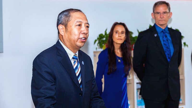 The leaders attending the unveiling ceremony were: Yu Huibin, vice president of the Red Cross society of Tianjin; Sha Hong, deputy district governor of the Nankai district, president of the district Red Cross; Wang Jianhua, vice president of Red Cross society of Nankai district; Zhang Lixin, assistant principal of Tianjin university; Feng Cuiling, party secretary of SPST, Tianjin university; dean Jay Siegel; associate dean Kim Baldridge. More than 40 students and teachers attended the event.