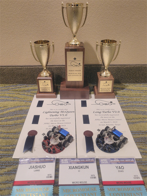 The APEC Micromouse Contest 2018 was held in San Antonio, Texas, USA on March 5th, 2018. The School of Electrical and Information Engineering, Tianjin University took part in the event on behalf of mainland China. They sent two micromouses: Lightening McQueen (team member: Zhao Yao, Liang jiashuo, Li Xiangkun; advisor: Liu Yingshu) and Long- Turbo 2.0 (team member: Zhang Shuai, Li Yadong, Kang Zhangqi; advisor: Wang Chao). They captured the top two places with two different search/speed run strategies, gained the “Best Studentaward, and stood out among teams from the US, Europe, Japan, and Taiwan, which became the highlight of the event.