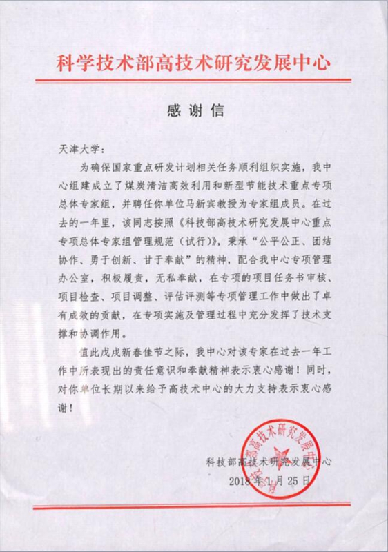 Recently, TJU received a letter of thanks from the High Technology Research and Development Center (HTRDC) of the Ministry of Science and Technology of the People’s Republic of China, in which Professors Ma Xinbin and Li Xianggao of the School of Chemical Engineering and Technology were acknowledged for their contributions.