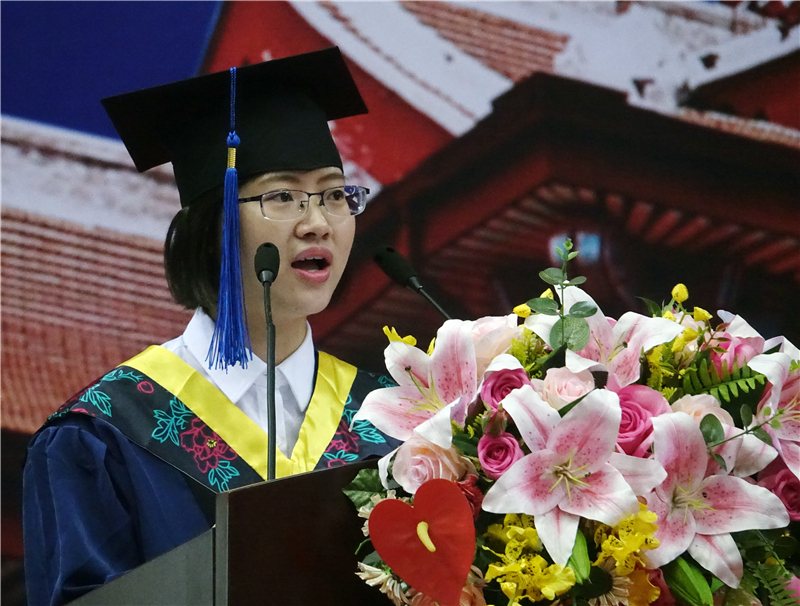 Professor Li Keqiu, Dean of both TJU’s School of Computer Science and Technology and TJU’s School of Software, and winner of the National Science Fund for Distinguished Young Scholars, spoke on behalf of the supervisors. He said, “I hope you will always be strict with yourselves, maintain a desire for innovation and carry forward the great TJU spirit of continuous innovation and meticulous scholarship.” Li urged graduates to open their eyes and pay attention to research new frontiers. Moreover, he advised them to expand their circle of friends and learn from excellent people.