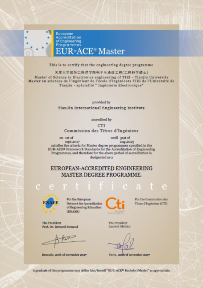 The Tianjin International Engineering Institute (TIEI) was established on the basis of national strategic demand and Tianjin University’s cultural confidence. It is an independently built pilot engineering education institute inspired by CTI and EUR-ACE. The accreditation of CTI and EUR-ACE means that graduates of Electronics, Computer Science and Smart Building majors can acquire a French engineering diploma authorized in Europe without going abroad. The recognition means the international assurance of the education standards of TIEI and provides potent evidence of the cultivation of leading international engineers.