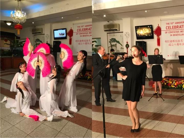At the celebration ceremony held later, the Chinese volunteer teachers from the Confucius Institute in Bratislava presented the Chinese dance "Blue and White Porcelain " while the local Bratislava band presented a vocal performance with strong national characteristics.