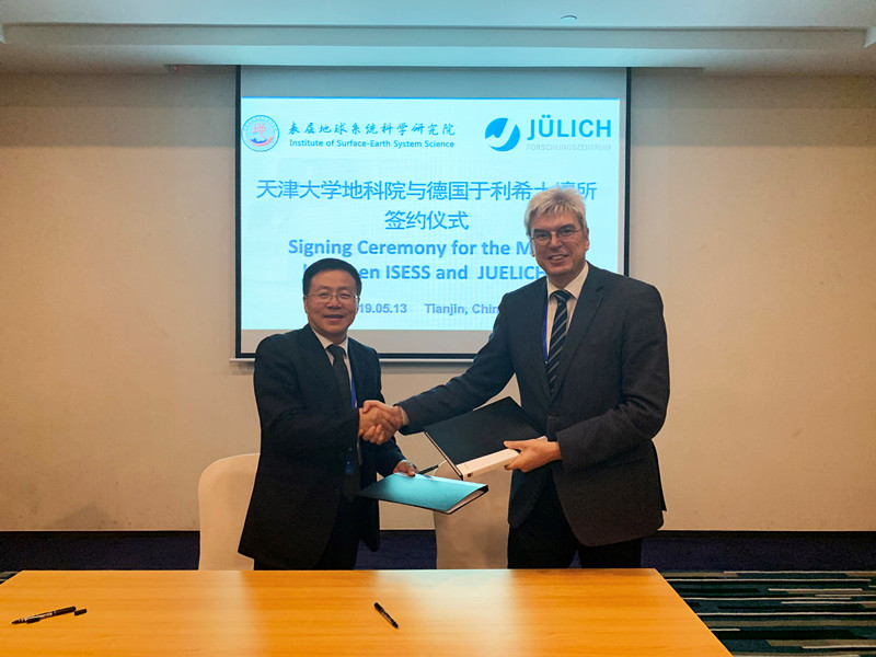 On the afternoon of 13 May during the International Workshop on Surface-Earth System Science, Prof. LIU Congqiang and Prof. Harry Vereeckent signed an Agreement for Cooperation on behalf the Institute of Surface-Earth System Science (Tianjin University) and the Agrosphere Institute (IBG-3) of Forschungszentrum Jülich GmbH.