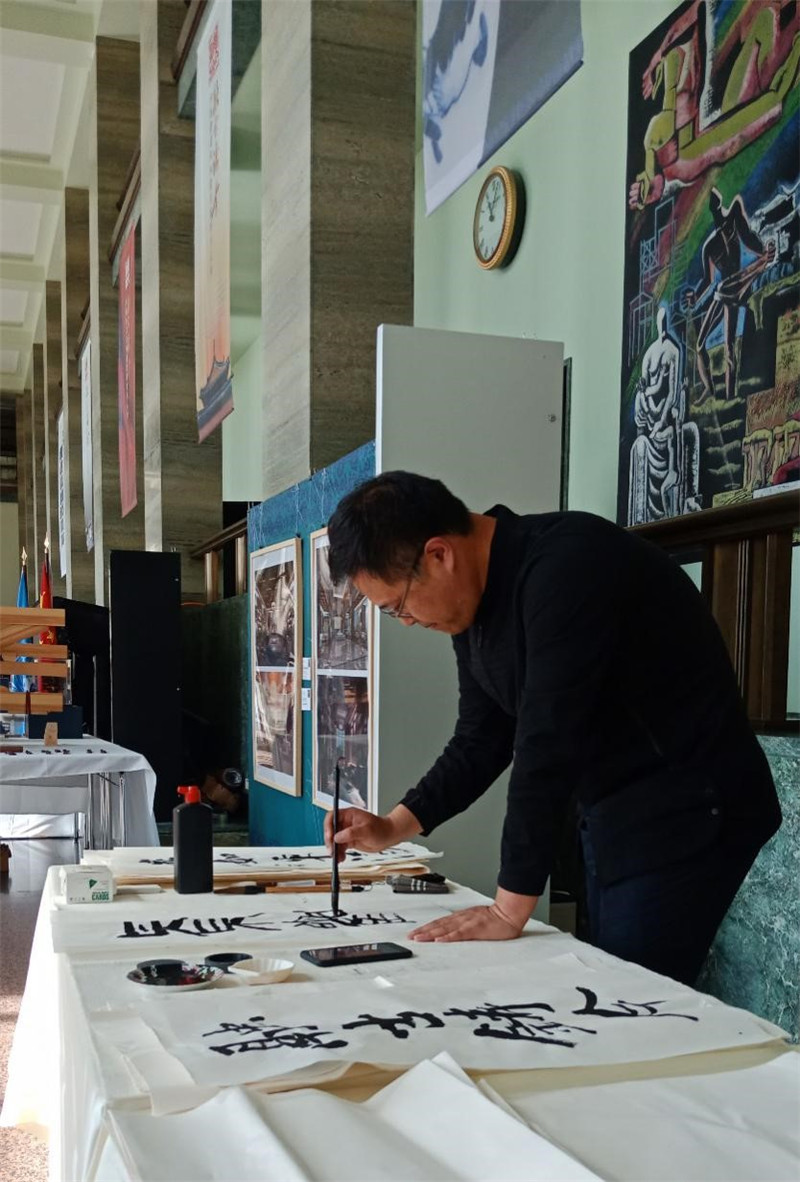 TJU associate professor Hu Yike shows Chinese calligraphy during the Chinese Language Day