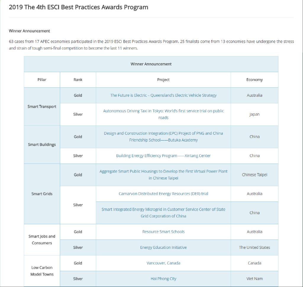 The APEC ESCI Best Practices Awards, the only Project Prize in APEC, rewards the excellent submissions within the APEC region in five categories which include Smart Transport, Smart Buildings, Smart Grids, Smart Jobs and Consumers and Low Carbon Model Towns. Since 2013, submissions have been collected, reviewed and given the award every two years. A Gold and a Silver Award were established respectively for each of the five categories.