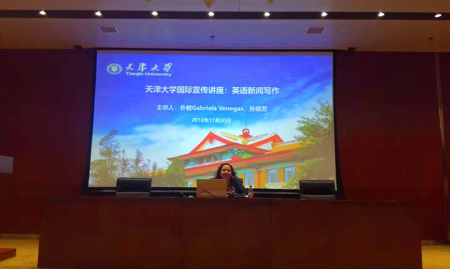 Gabriela Venegas gives a lecture on English news writing.