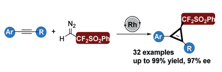Chiral cyclopropene has been widely noted in the field of synthetic chemistry due to its versatile reactivity. The asymmetric cyclopropylation of alkynes with diazo compounds is an effective way to construct such tension ring molecules. Doyle, Corey, Davies and others took the lead in the [2 + 1] cycloaddition reaction of terminal alkynes, and achieved great success. Due to the increase of steric hindrance and the decrease of activity, the catalytic asymmetric cyclopropylation is an important challenge in synthetic chemistry. Thus far, the Davies team has reported the only successful example, but it needs Au-Ag catalysis, and a donor acceptor type diazo ester substrate. In addition, fluorine-containing diazo compounds have developed into an important part for the construction of many fluoride alkylation carbocyclic rings, heterocycles and open-chain molecules in recent years, but the asymmetric cyclopropylation reactions in which they participate have not been reported.