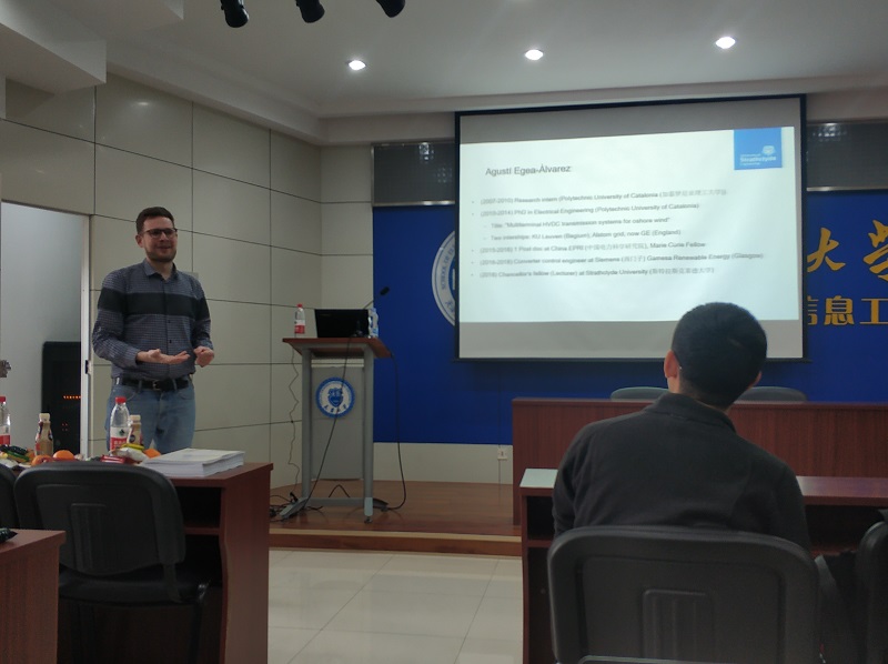On November 22, 2019, Dr.Agustí Egea-Àlvarez and Mr.Callum Henderson, a PhD studentfrom the University of Strathclyde, UK visited the School of Electrical and Information Engineering. He presented a report about “Challenges and potential solutions for power systems with high penetration of power converters: a British perspective” on the Weijin Road Campus. Over 50 students and staff attended the speech.