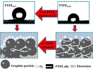 In this research, PTFE0.57showed the highest H2O2 yield of 3005 ± 58 mg L−1h−1(at 25 mA cm−2) and highest current efficiency (CE) of 84% (at 20 mA cm−2).It is achieved via tuning catalyst mesostructure and hydrophilicity/hydrophobicity by adjusting polytetrafluoroethylene (PTFE) content in graphite/carbon black/PTFE hybrid catalyst layer (CL).Rotating ring disk electrode (RRDE) results demonstrated that less PTFE content in CLs results in less electrons transferred and better selectivity toward two-electron ORR.