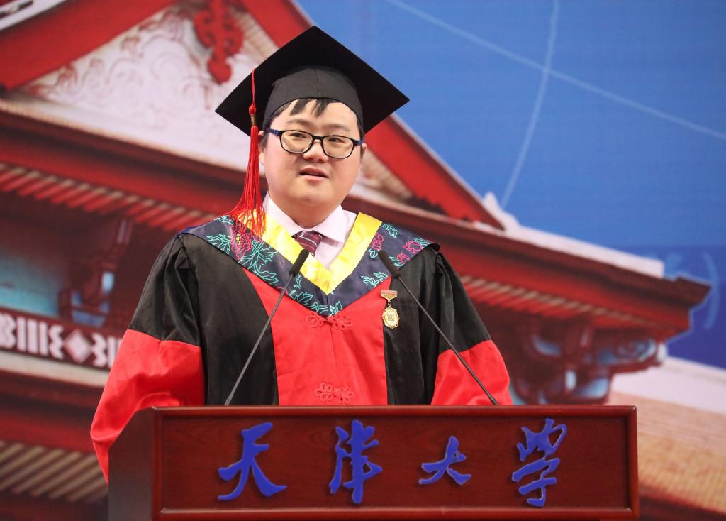 Pu Zhihua, a doctoral student of the School of Precision Instrument and Optoelectronics Engineering, made a speech as a graduate representative. In his six years of study at Tianjin University, he has gained scientific research achievements, honor, love and family. He published 18 academic papers as the first author. Two of them were published as cover articles in area I of the SCI journal which ranks first in the field, and made two conference reports at the top international academic conferences in the field. He also served as monitor of the class, vice chairman of doctoral student association, participated in the Peiyang chorus, and volunteered for the Paralympic Games. In his opinion, if one wants to break through the cocoon and become a butterfly, one needs to suffer; if one wants to create a better life, one needs to work hard. He also called on all the students to continue to adhere to the motto of Tianjin University to “seek truth from facts.” He called on all students to remain true to their original aspiration and strive hard to pursue the great dream as an outstanding Tianjin University person.
