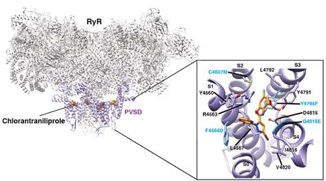 In this study, the team successfully solved the cryo-electron microscopy (EM) structure of chlorantraniliprole, the best-selling diamide insecticide, in complex with RyR at 3.8 Å resolution. Chlorantraniliprole is located in the pseudo-voltage-sensor domain (PVSD) of RyR. The molecule induces a conformational change by affecting the S4-S5 linker, triggering channel opening, which causes the uncontrolled release of calcium ions from endoplasmic reticulum store, contraction paralysis, and ultimately the death of treated larvae. Interestingly, the four known resistance mutations are all located near the insecticide binding pocket, but cause resistance via two mechanisms, either by mutating key residues involved in binding or by introducing steric hindrance.The binding site is further corroborated with data from cellular, Drosophila, and in silico mutagenesis studies, which reveal how diamide insecticides are selective to the Lepidoptera group of insects over honeybee or mammalian RyRs.