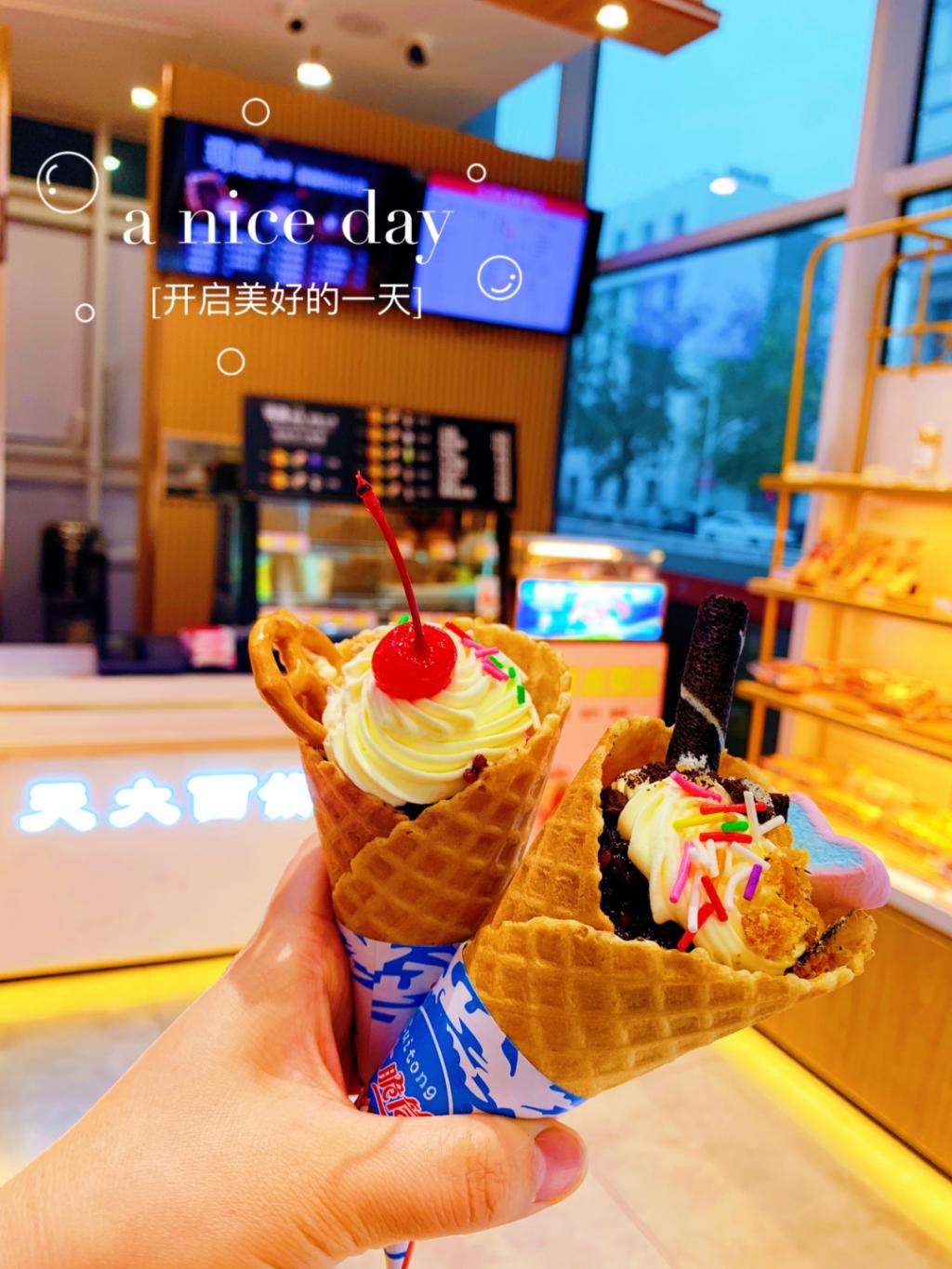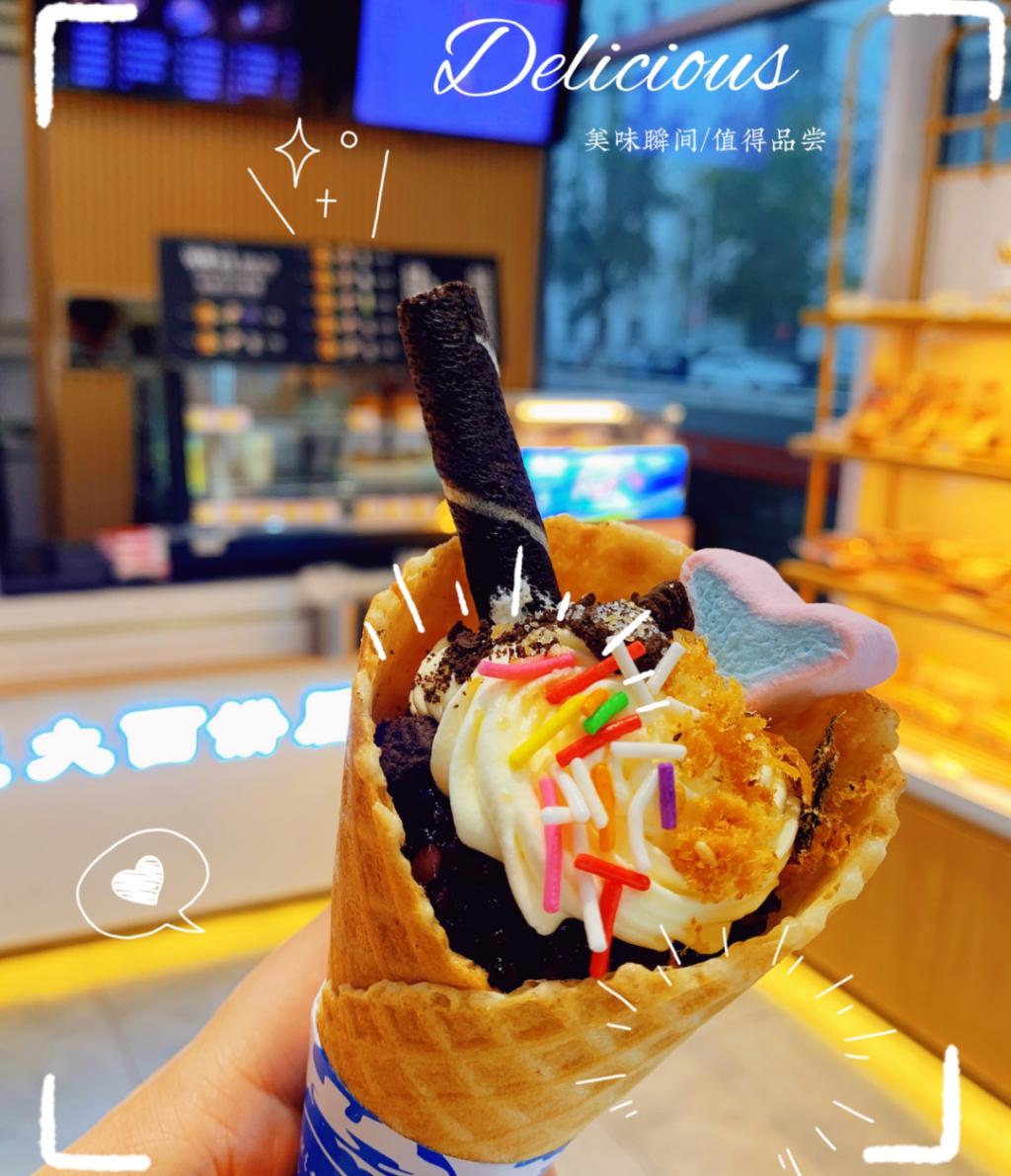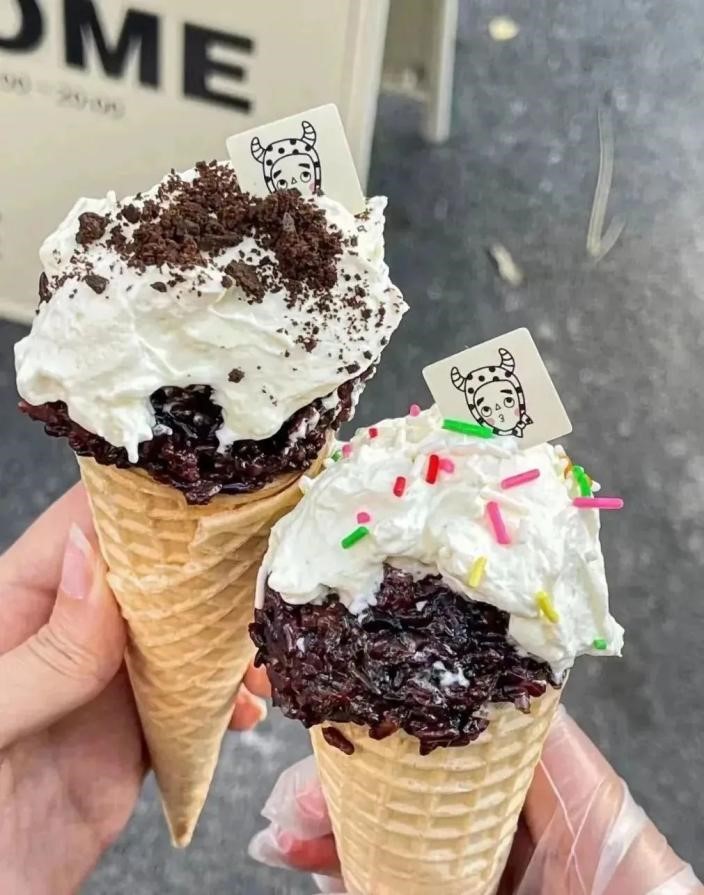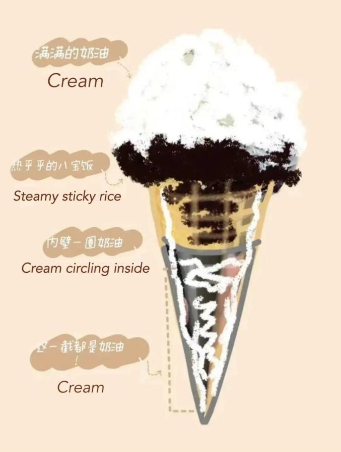 Put the whipped cream on the bottom of an ice-cream cone, cover the cream with ooeygooey sticky hot rice, then put cream on top of it with sprinkles as a decoration. A delicious Re Naibao is made.