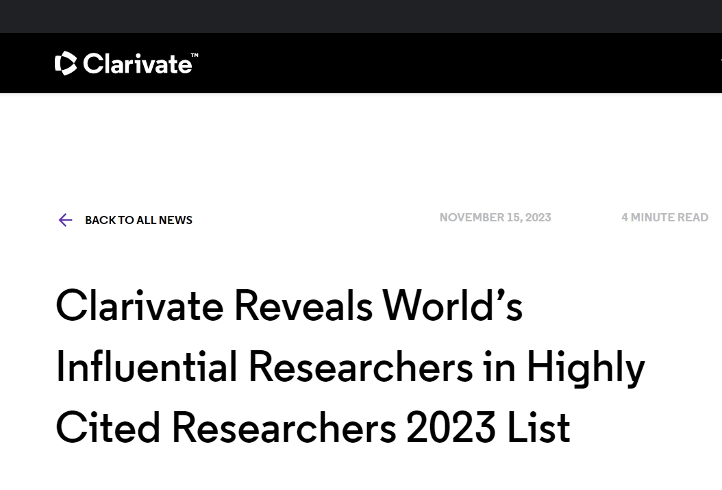 The Highly Cited Researchers list by Clarivate is an annual recognition of influential scientists and social scientists worldwide who have made significant contributions to their fields. This year, 7,125 Highly Cited Researcher 2023 designations were issued to 6,849 individuals from more than 1,300 institutions in 67 countries and regions around the world. A total of 1,275 researchers from Chinese mainland have been selected.