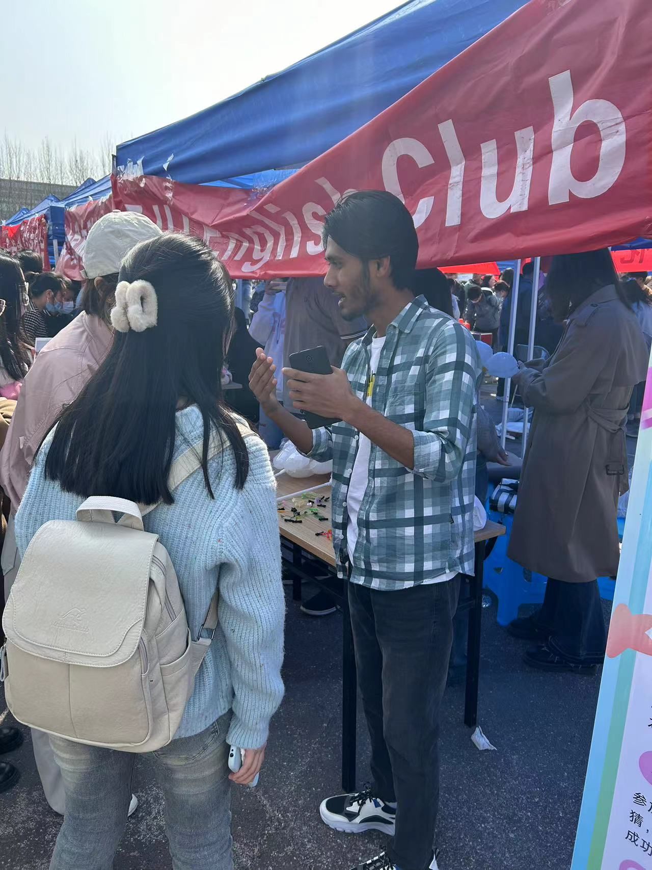 As a member of English Club, foreign students are promoting the positive atmosphere of learning English in the club to other students.