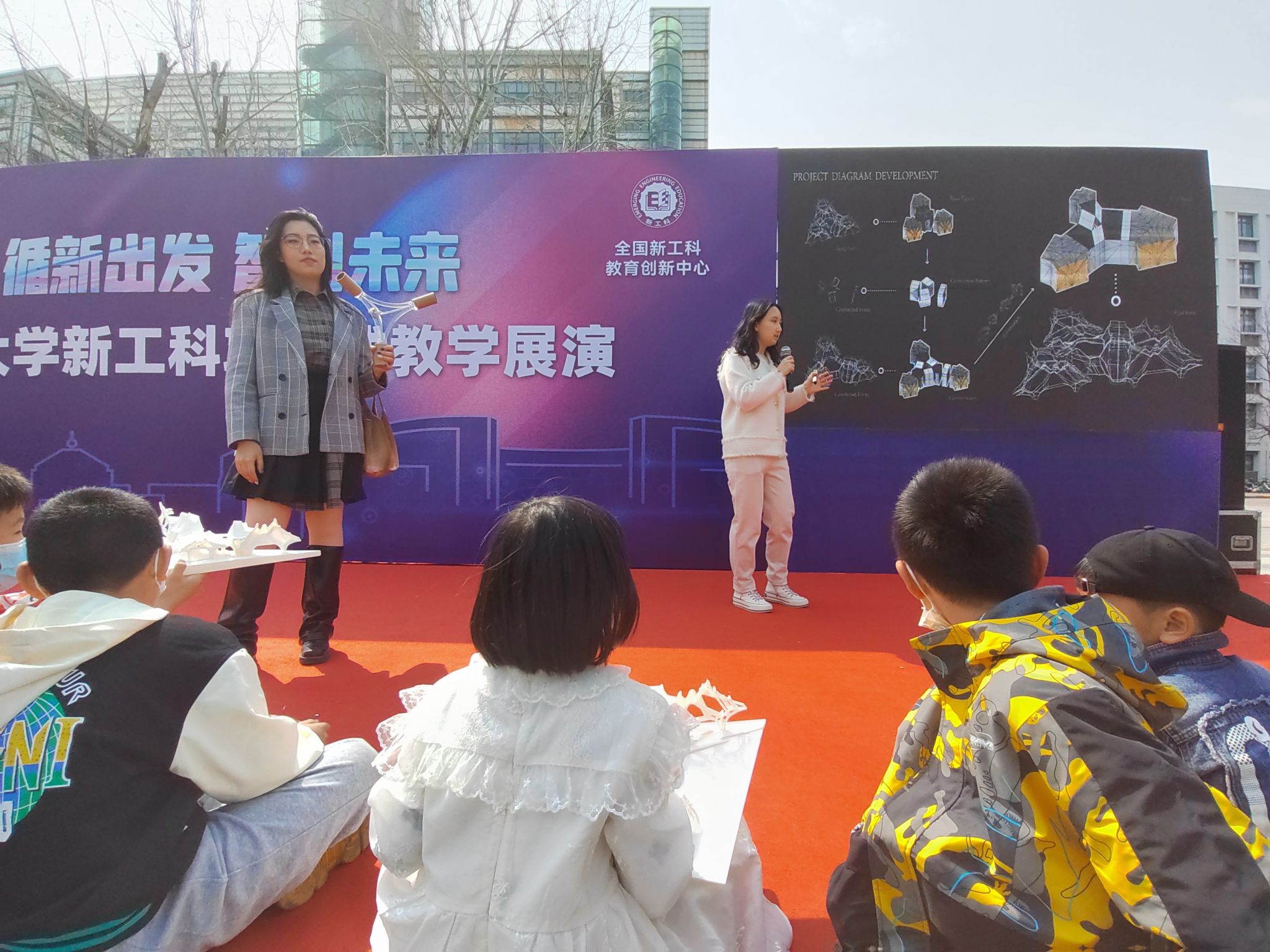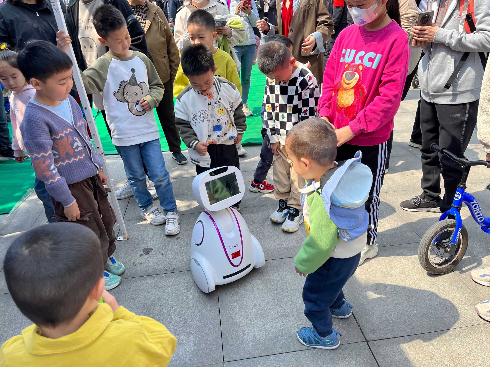 The children are looking at the robot curiously.(Photo by Wen Shixuan from the School of Foreign Languages)