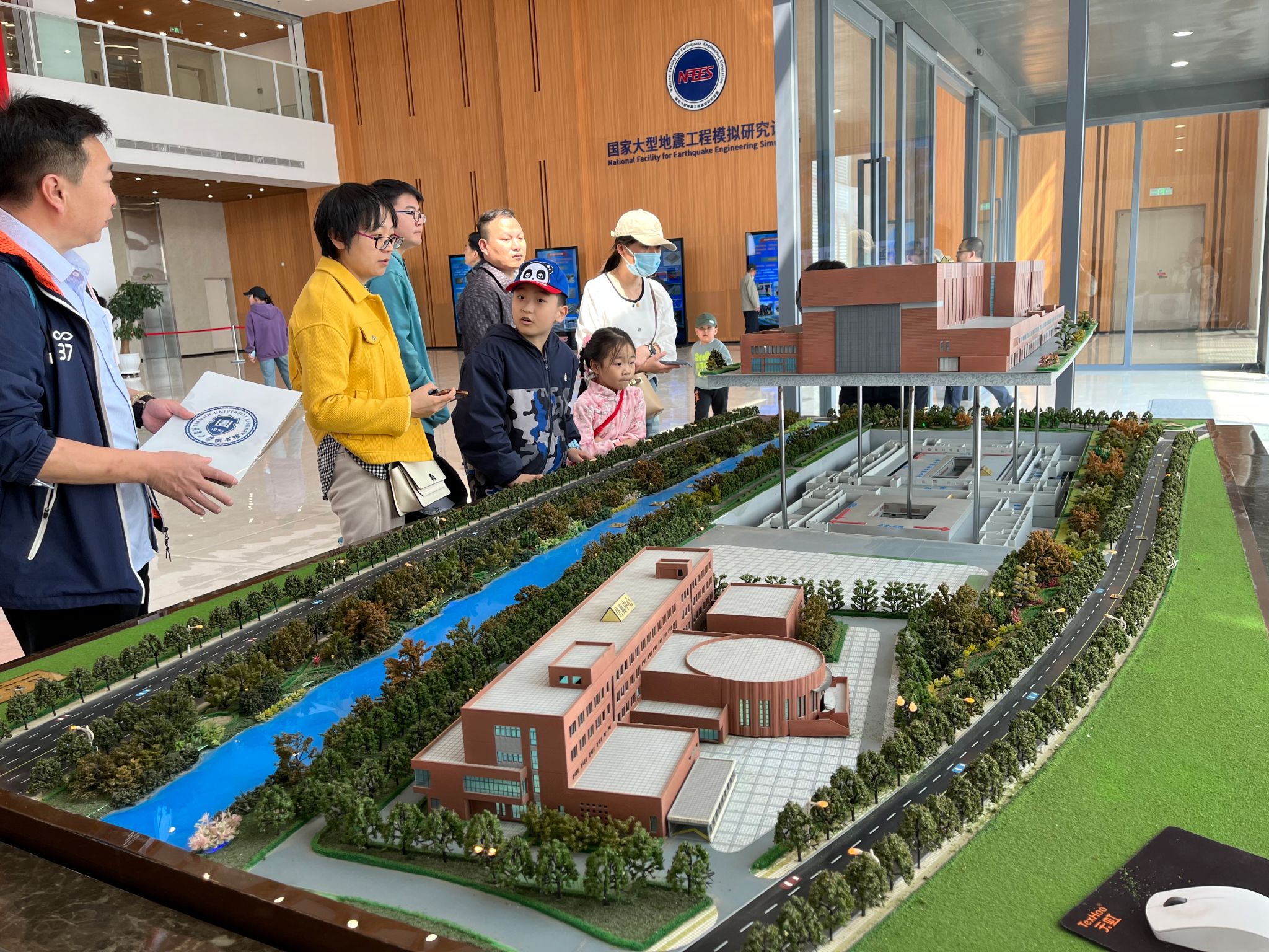 Listening to the instruction of the earthquake simulation facility.(Photo by Wen Shixuan from the School of Foreign Languages)