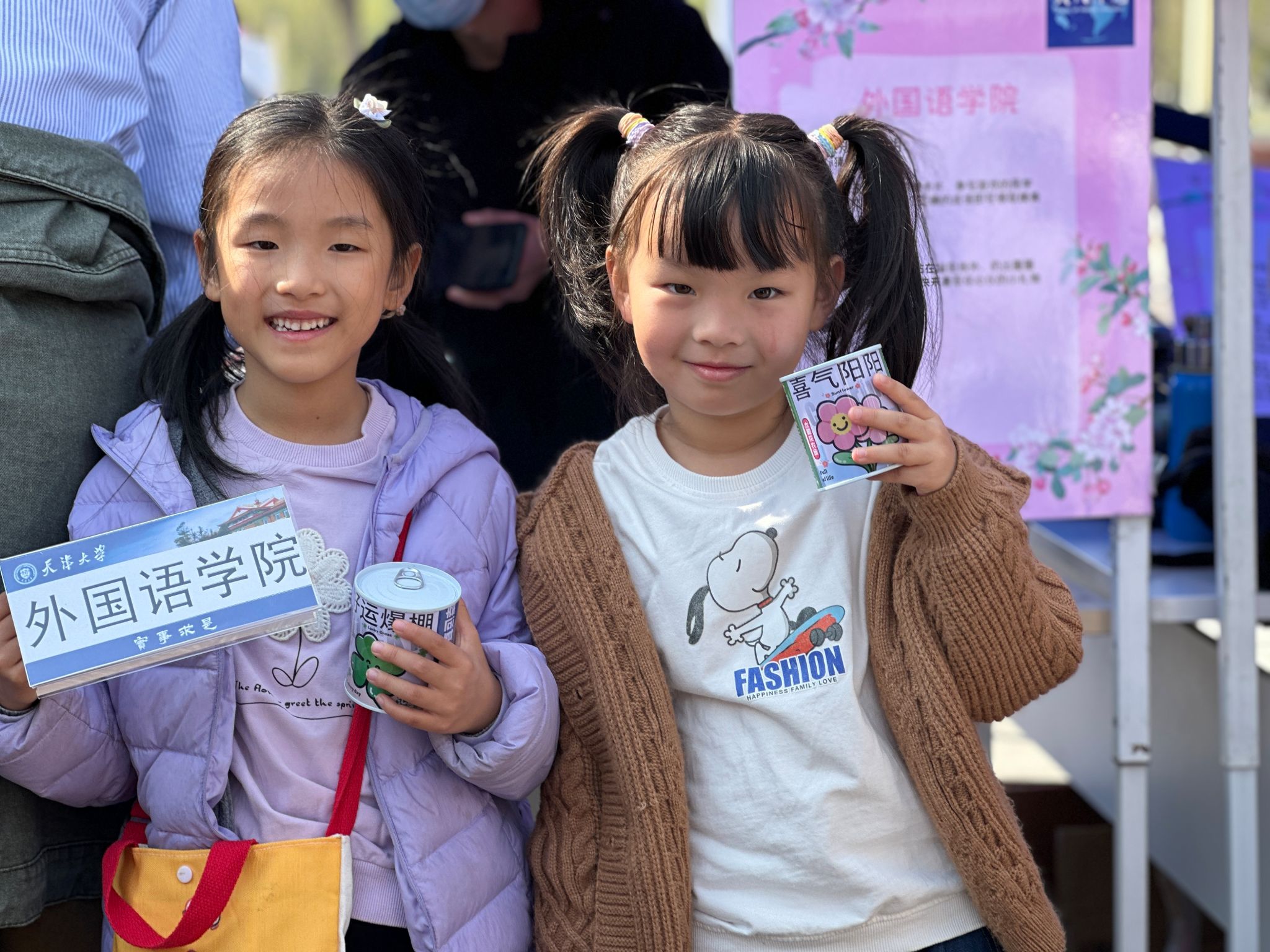 Two little girls are showing off their awards after winning the ringtoss game.(Photo by Zhu Qianxi from the School of Foreign Languages)