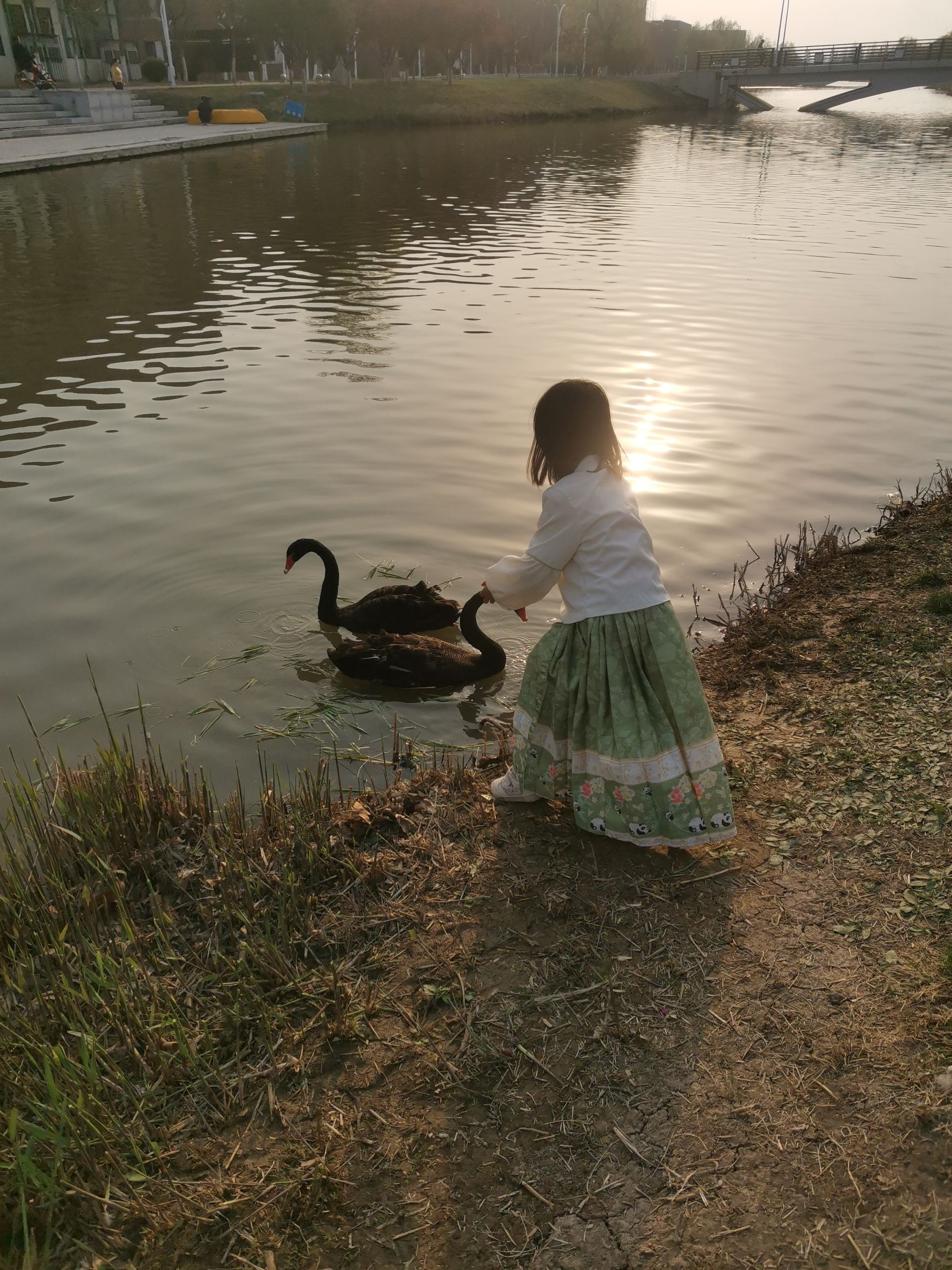 A girl in traditional costumes is feeding swans.(Photo by Bai Yanzhao from the School of Foreign Languages)