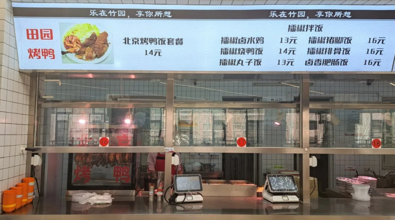 Moreover, Zhuyuan Dining Hall (Dining Hall No.4) dishes up braised meat on rice or noodle with mashed potato and rice with Peking Roast Duck.