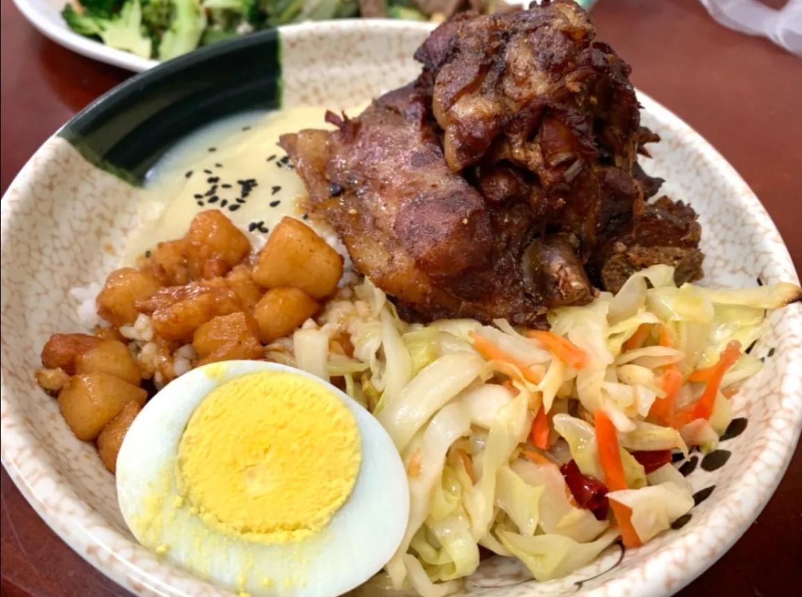 Braised pork knuckles on rice with mashed potatoes