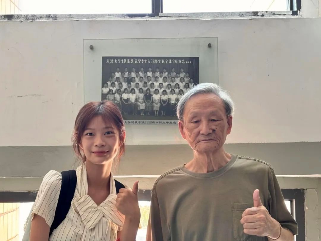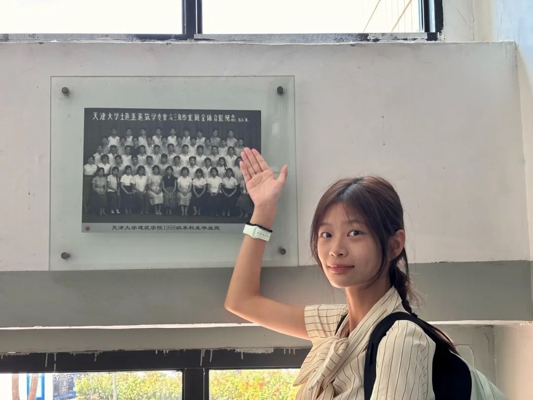In a heartfelt moment during the 2024 orientation season, a special photograph was taken at Tianjin University’s School of Architecture. The image captures Gao Yichen, a new architecture student, standing beside a 1958 class graduation photo, in which her grandfather is featured.